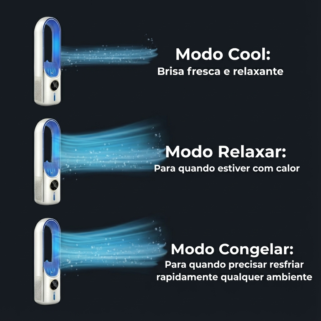 O FreshMax possui 3 modos de resfriamento, ideais para quando você quiser um resfriamento máximo ou apenas uma temperatura agradável. Em todos os modos, ele funciona em completo silêncio. A lâmina com persianas ajustáveis permite mover o fluxo de ar frio para cima, para baixo, para a esquerda ou para a direita, garantindo conforto em qualquer direção.